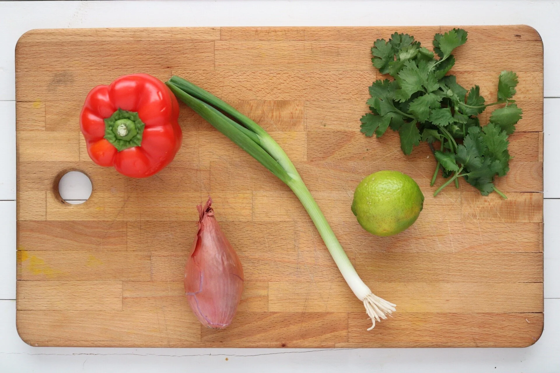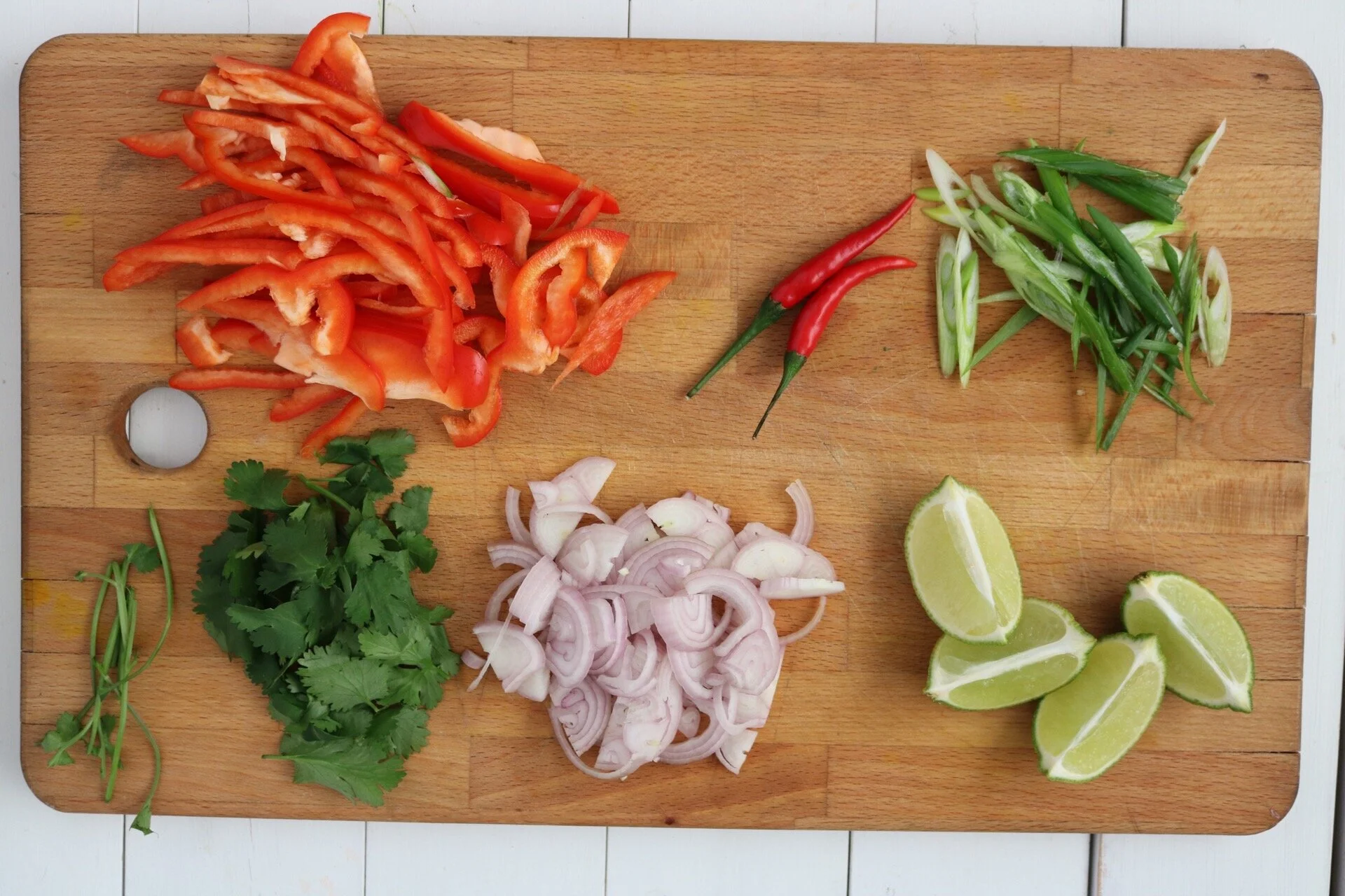 ingredients: rice noodles, shallot, red pepper, basil, cilantro, lime, snap peas, green onion