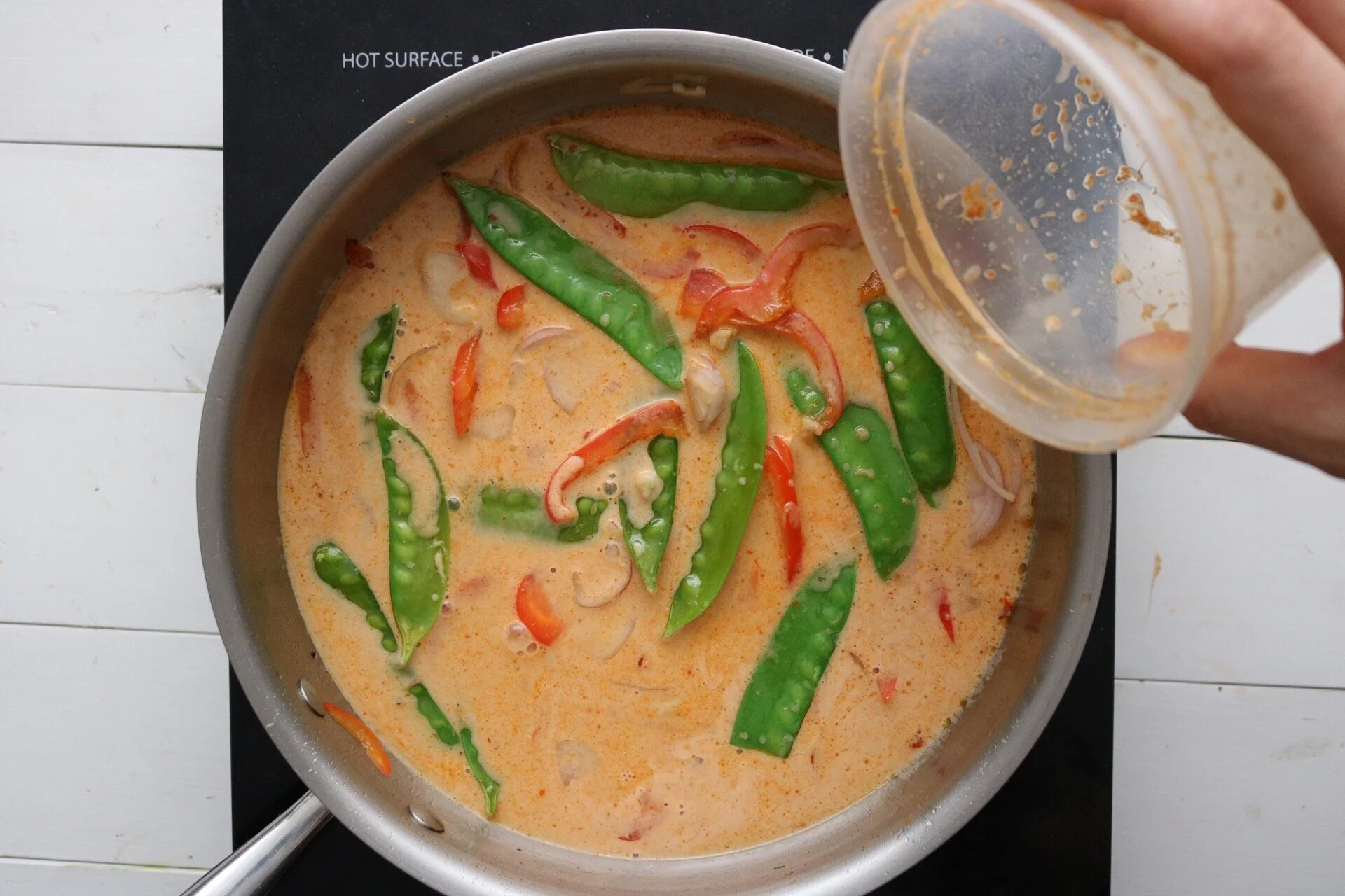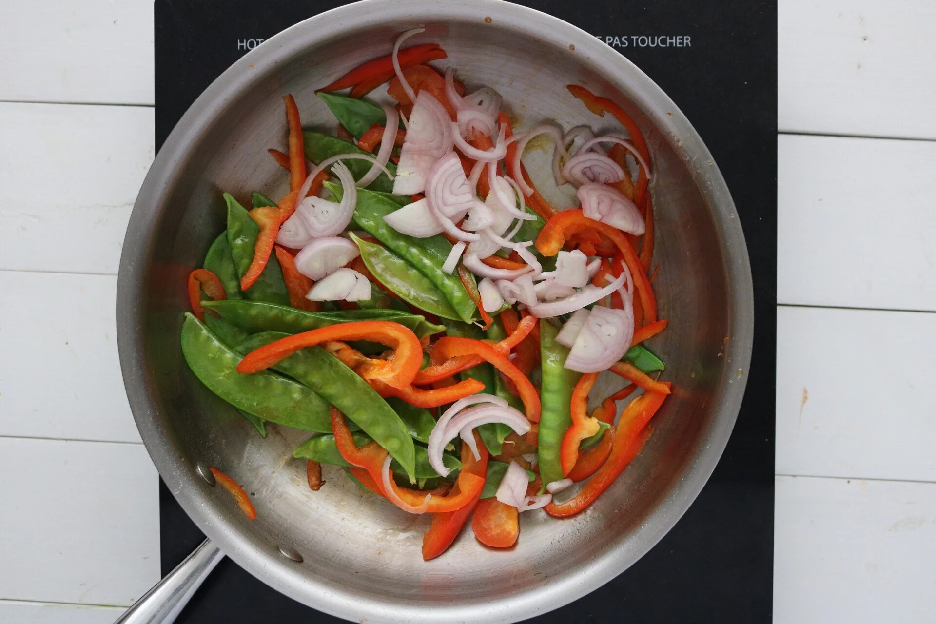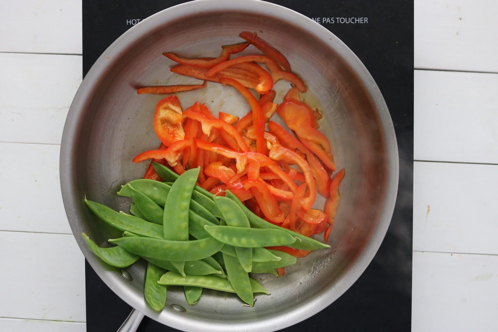 In a large sauce pan bring 2 tbsp of oil up to medium high heat. Once hot add in your snap peas and red pepper , let cook for 5-7 minutes stirring often. Next add in your shallots and let that cook for another ~5 minutes. Then add in your soup broth + 2 cups of water*, mix and add squeeze in the juice of half a lime.