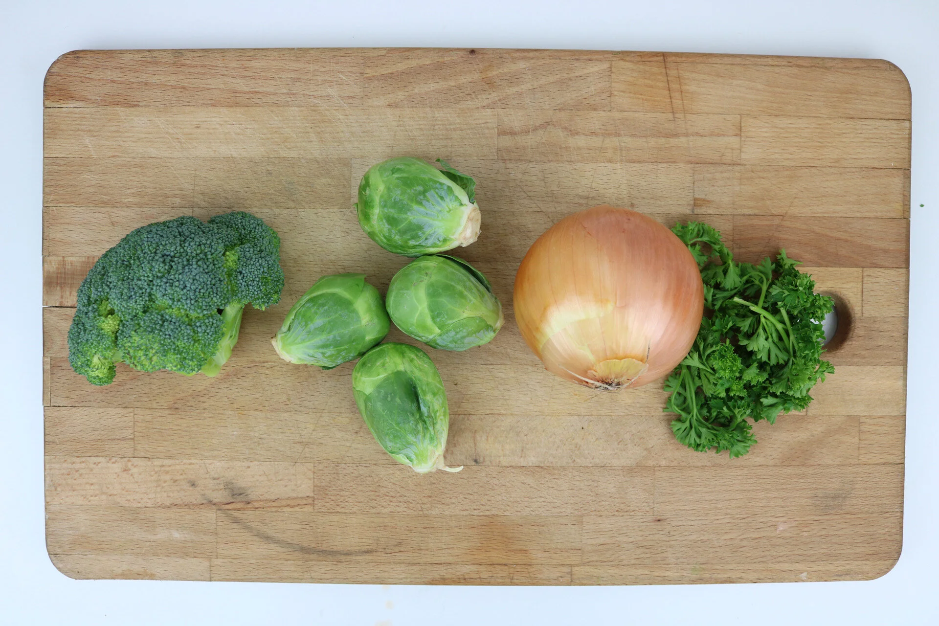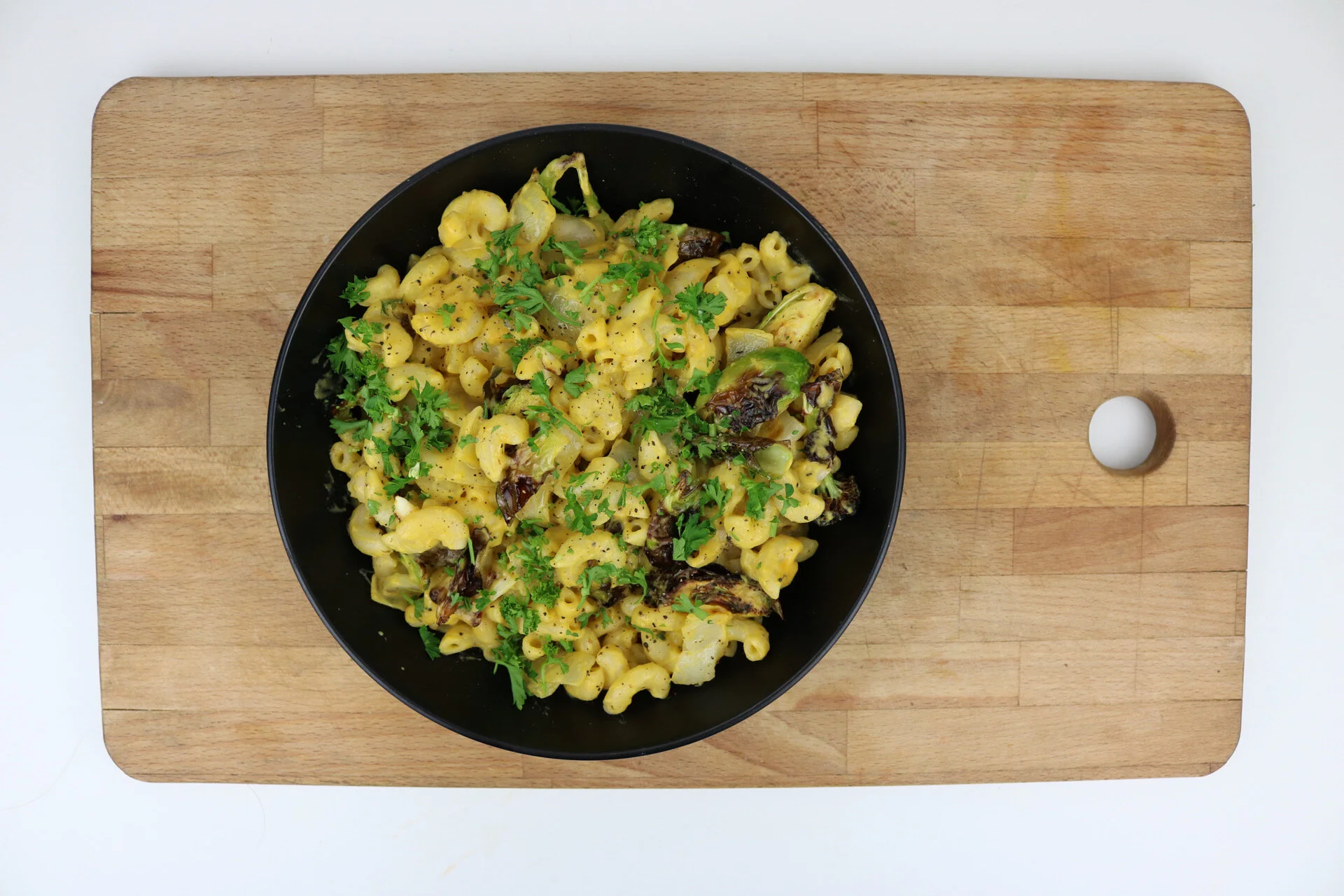 ingredients: elbow pasta, onion, broccoli, brussel sprouts, parsley