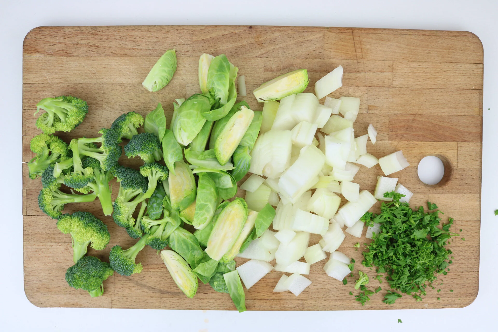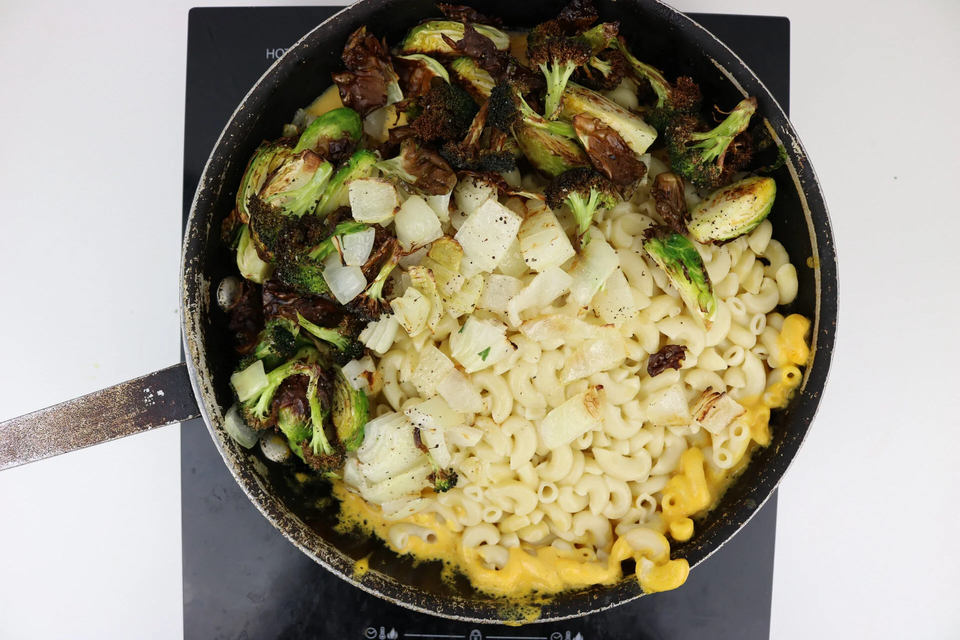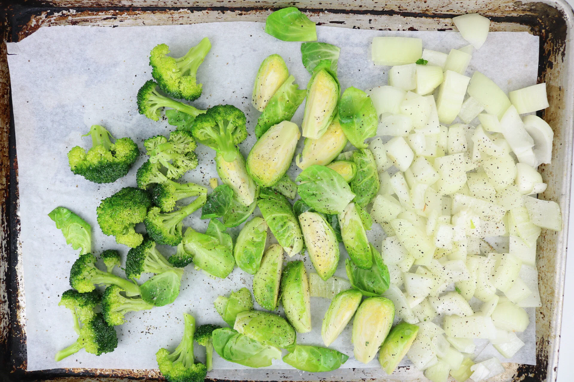In a bowl, toss your brussels sprouts, broccoli & onion together with a pinch of oil + salt & pepper. Transfer to a baking sheet and bake for 12-15 minutes until all your veggies are well roasted.
